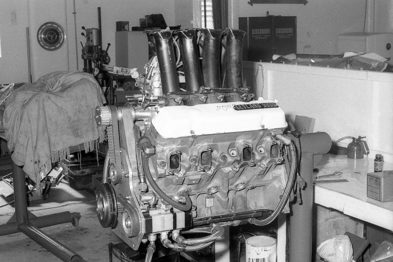 McCormack engaged famous Aussie engineer Phil Irving (ex Repco, Vincent) to further develop the engine from its Repco base. Irving designed new heads, cast by Comalco, which eliminated separate valve guides and seats. The design also featured a bent pushrod to allow more room for straight inlet ports. John said ‘Power increased to around 435bhp and 410ft/lbs of torque, more mid range punch than the Repco Holden. An alternate cam delivered 470bhp/380ft/lbs but this stressed the overall package causing many block failures. ‘All the talk on Friday night at the Horsepower Hotel never won races, it was about torque as well as power and whilst we were light on power we had plenty of mid range punch and a well balanced overall car package.’
