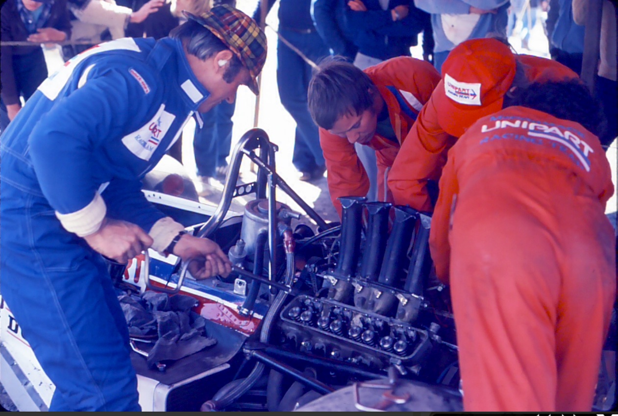 Whether the shot below was taken on the same day is unclear, the very tall Mike Parkes stands out mid-pic with liddl’ Art Merzario second left and Clay Regazzoni to the right of the car, closest to us.