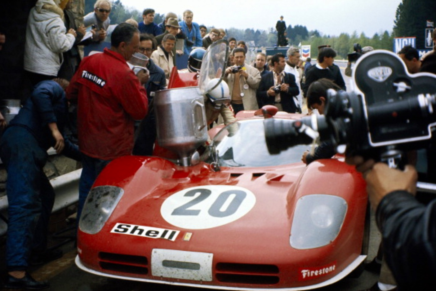 Busy pit stop for the Ickx/Surtees second placed 512S. Surtees jumping in, Ickx clear in the helmet behind, Spa 1970 (Rainer Schlegelmilch)(ferrari.com)