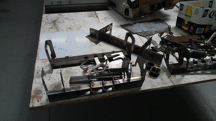 Dummy fit of steering mount/roll hoop, roll bar, suspension top mounts, nose-cone support. Roll-over bar leg just visible in far left middle of shot.