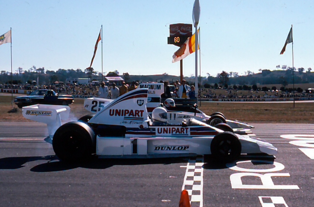 Oran Park Gold Star round 1978. McCormack, Graham McRae, McRae GM3 Chev, Elfin MR8 at rear (John Shingleton)