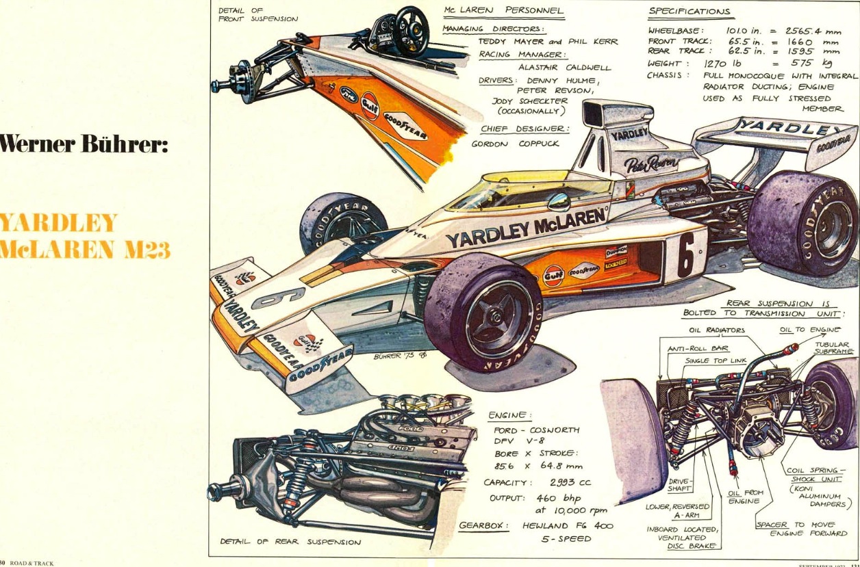 The car followed the conceptual path blazed by the Lotus 56/72 in having a chisel nose, side radiators and rising rate suspension, rather than the Tyrrell bluff nose alternative aero approach of the day. McLaren’s very successful M16 Indycar followed the 72 so it was a logical step for Coppuck, using the well established McLaren interactive design approach, with many on the shop floor having input into the conceptual stages of new car development.