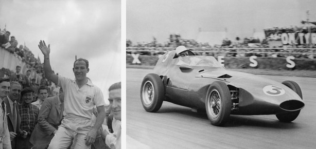 Moss during and after the 1956 Silverstone International Trophy win, Vanwall. Note Colin Chapman third from the left, who are the other fellas in shot? (Getty)