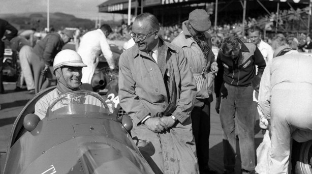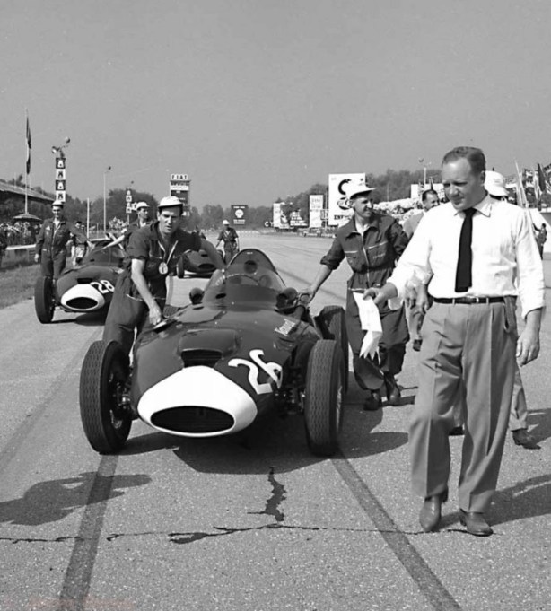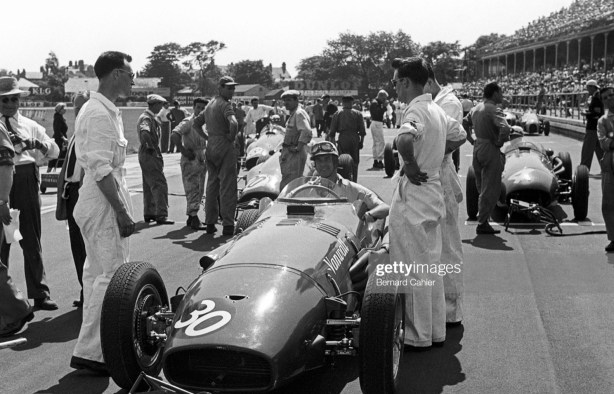 Harry Schell awaits the start of the 1955 British GP at Aintree with the lads including the chief at far left. #4 is the Luigi Musso Maserati 250F, #20 is Eugenio Castellotti’s Ferrari 625, #8 Andre Simons’s 250F