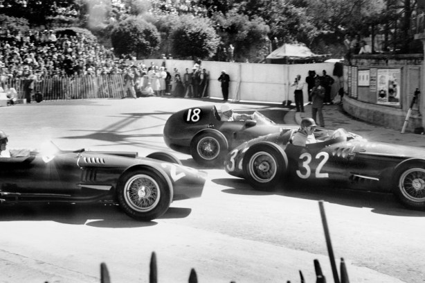 Mano e mano- first lap of the 1957 Monaco GP with Fangio’s Maserati 250F from pole in front of the Moss Vanwall on the outside and Peter Collins’ big Ferrari 801 menacing from the inside- first, DNF accident times two the outcome.