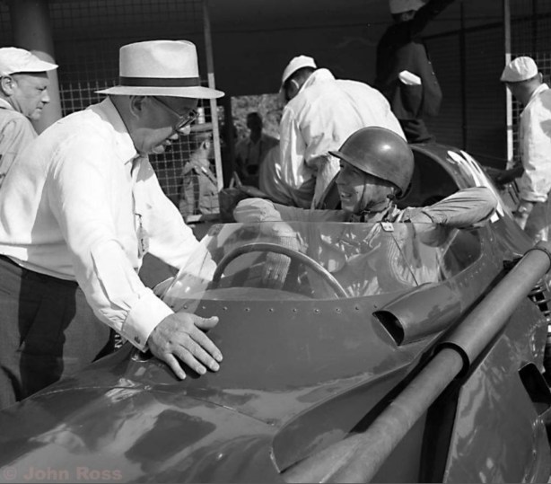 The Chief, Tony Vandervell with Tony Brooks in the Monza pitlane in 1958 the day before Brooks went out and won the Italian GP, Vanwall VW5 (John Ross)