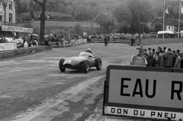 Harry Schell dives into La Source at Spa in 1956, Vanwall VW56- he was fourth in the race won by Peter Collins Lancia Ferrari D50 from local boy, Paul Frere’s similar car.