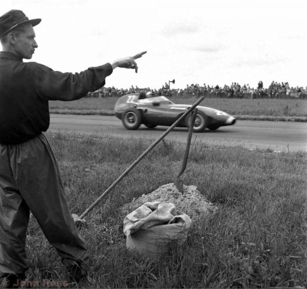 Journalist/author Graham Gauld points the direction of Aintree travel to Stuart Lewis-Evans during the 1957 British GP. Bucket, spade and pile of dirt to deal with fires and errant pools of lubricant/coolant. Interesting shot, i like it.