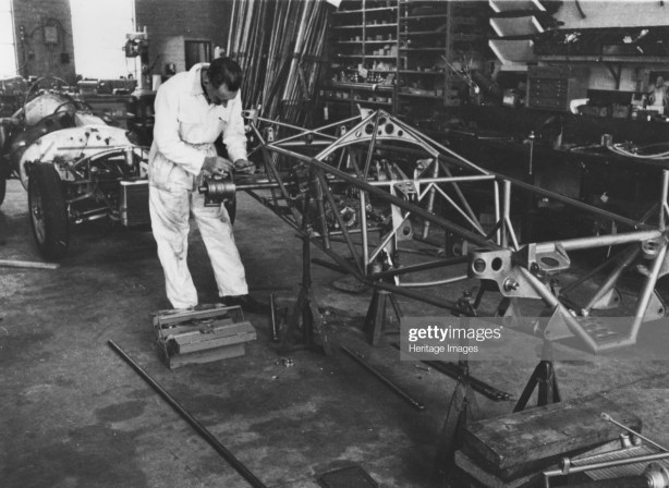 One of Chapman’s new frames coming together at VP Maidenhead plant in early 1956- car behind perhaps one of the 1955 cars being reduced to parts?