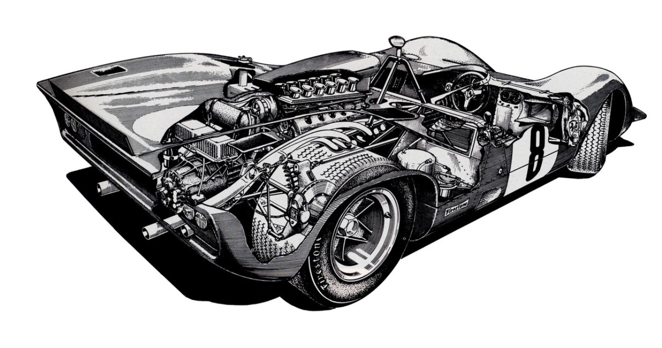 The most striking feature of the car was its Costin designed, teardrop shaped body. Painstaking attention was devoted to underbody fairing, the elliptical body section was designed to minimise deflection in cross winds and drag. Flush ‘NACA’ ducts were used and the distinctive tall headrest faired a 39 gallon fuel tank with two subsidiary 15 gallon tanks located low on each side of the scuttle.