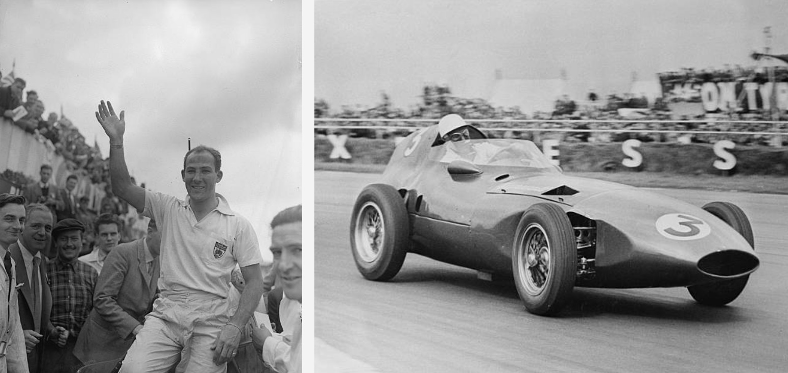 Moss during and after the 1956 Silverstone International Trophy win, Vanwall. Note Colin Chapman third from the left, who are the other fellas in shot? (Getty)