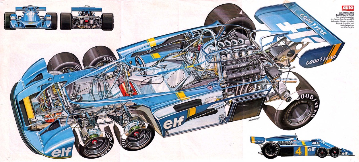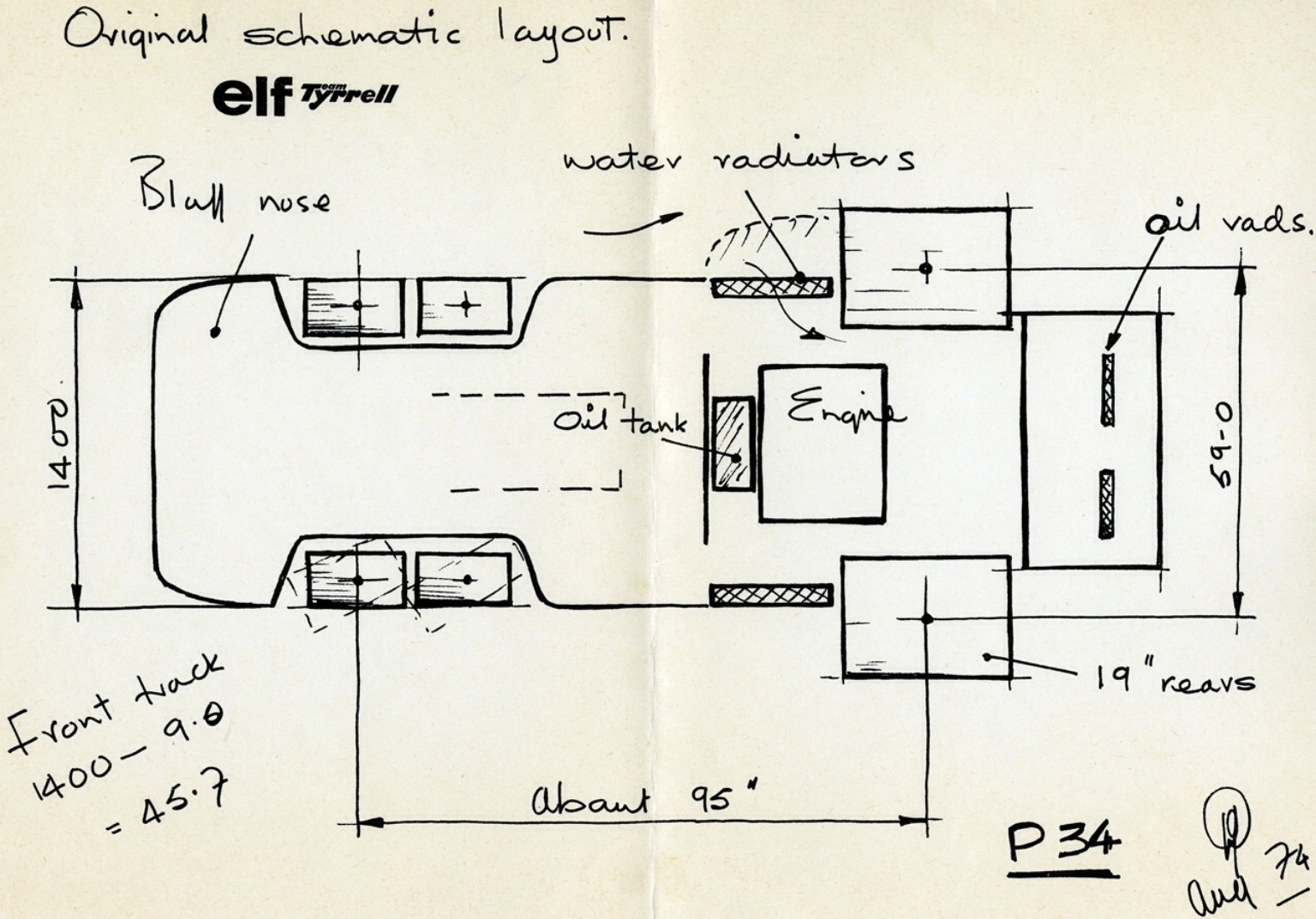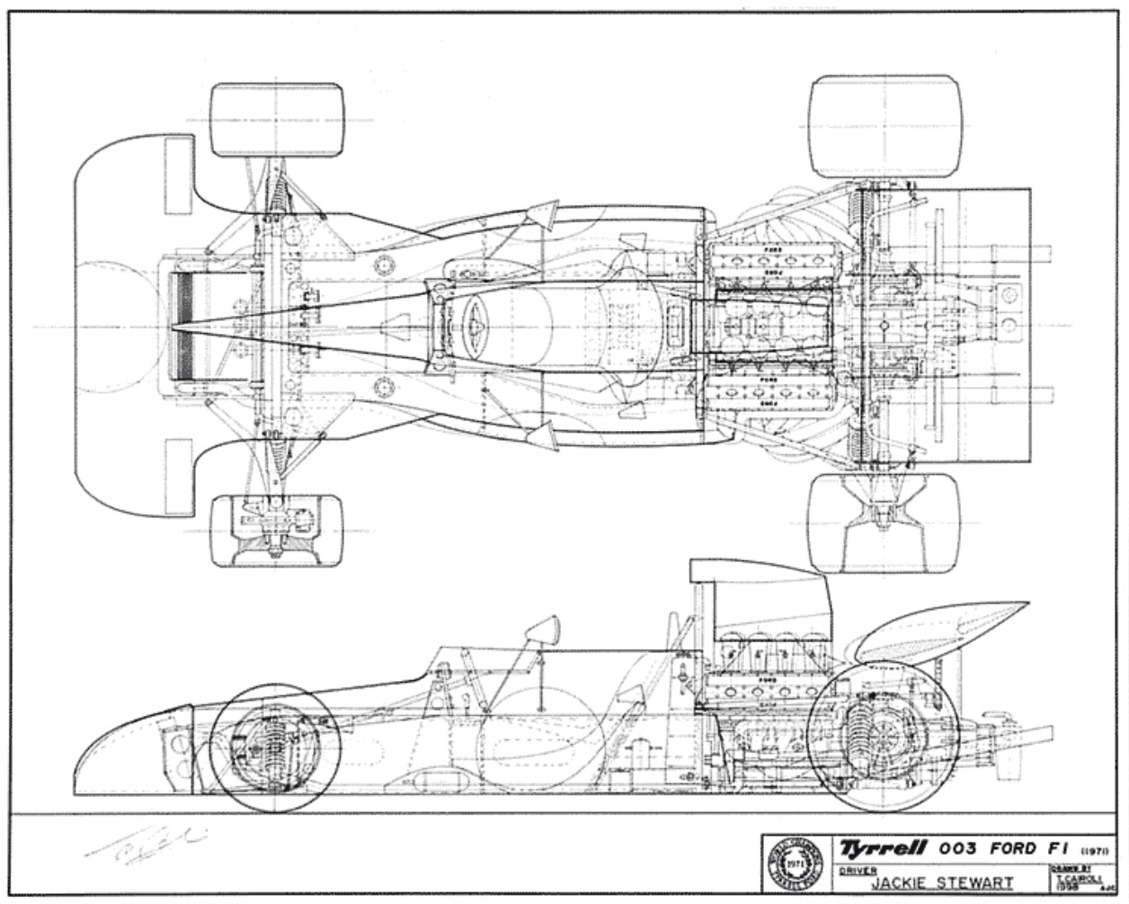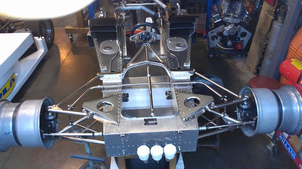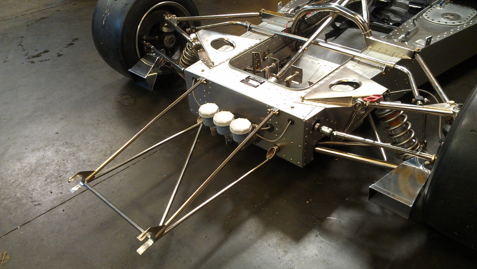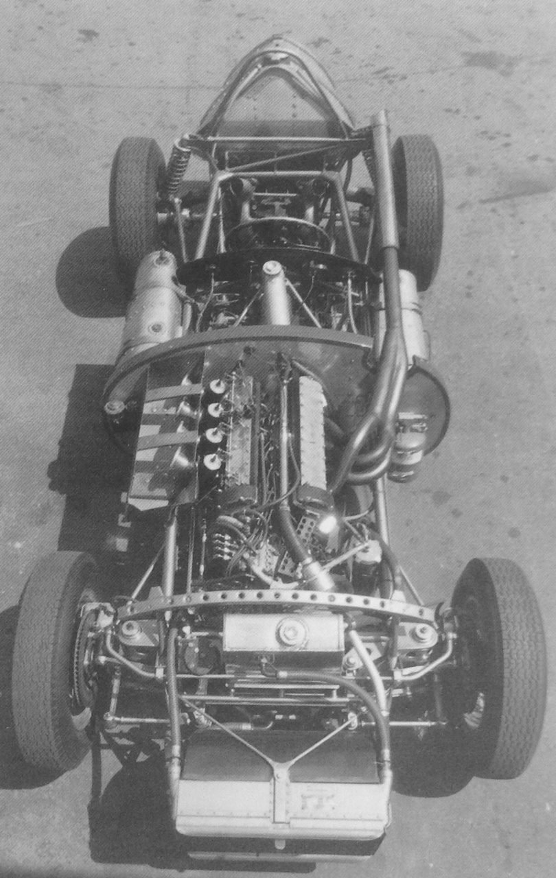 Ferrari derived transaxle, cockpit layout, rear and twin side fuel tanks and radius rods to locate rear suspension fore/aft all visible, again, further technical details as per text.