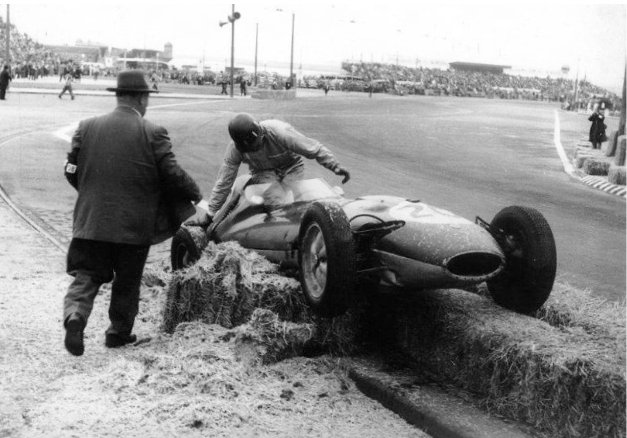 Tragedy struck on lap 42 when the engine in the Stuart Lewis-Evans Vanwall blew, the car’s rear wheels locked then the car careered into a small stand of trees- the vulnerable tail tank ruptured and caught fire, Lewis-Evans jumped out but was disoriented and headed away from fire marshalls who may have been able to minimise the terrible burns from his overalls- despite being flown home to the UK he died in a specialist hospital six days later.
