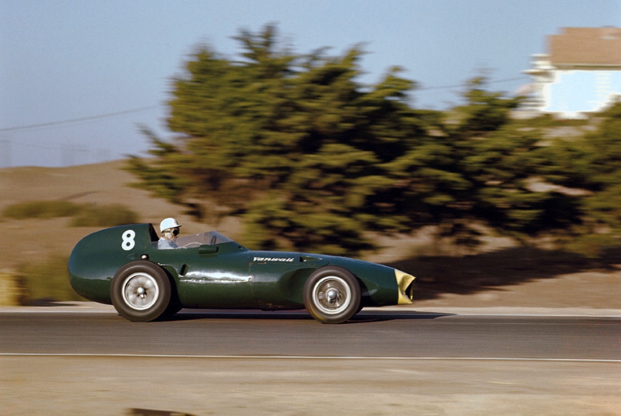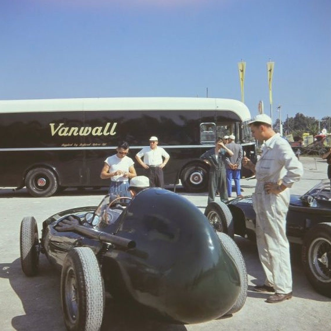 This shot shows the relative height of the Vanwall, which was very tall, the driver sitting atop the drive-shaft.