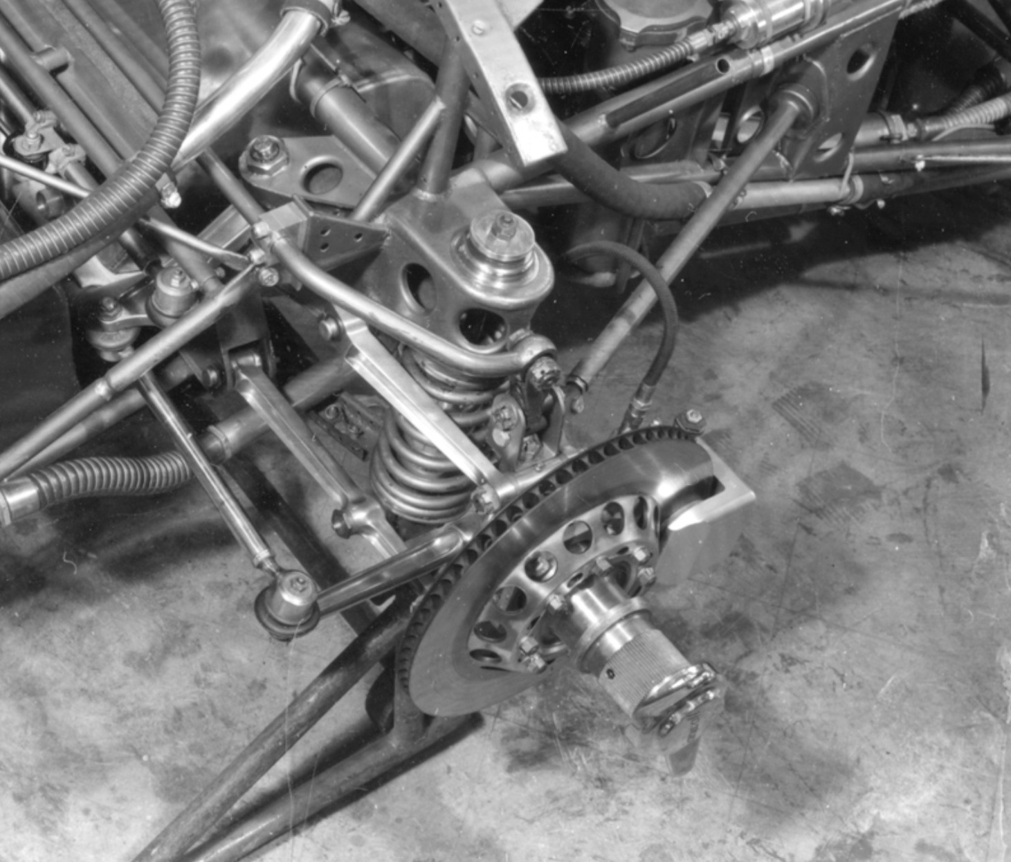 High quality of forgings and fabrication of spaceframe chassis evident. Front cross-member visible, steering arm, top link, radius rod, coil spring/damper unit and Goodyear patented disc brakes (Vandervell Products/The GP Library)