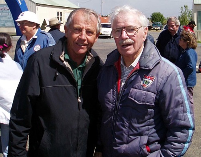 Spencer Martin and David McKay pictured on 27 October 2004. Chris Haigh took this shot having just taken David for a lap of Wakefield Park, Goulburn, NSW in McKay’s original Jaguar Mk1 ‘The Grey Pussy’. David died on December 26 2004 at 83 of cancer. (Chris Haigh)