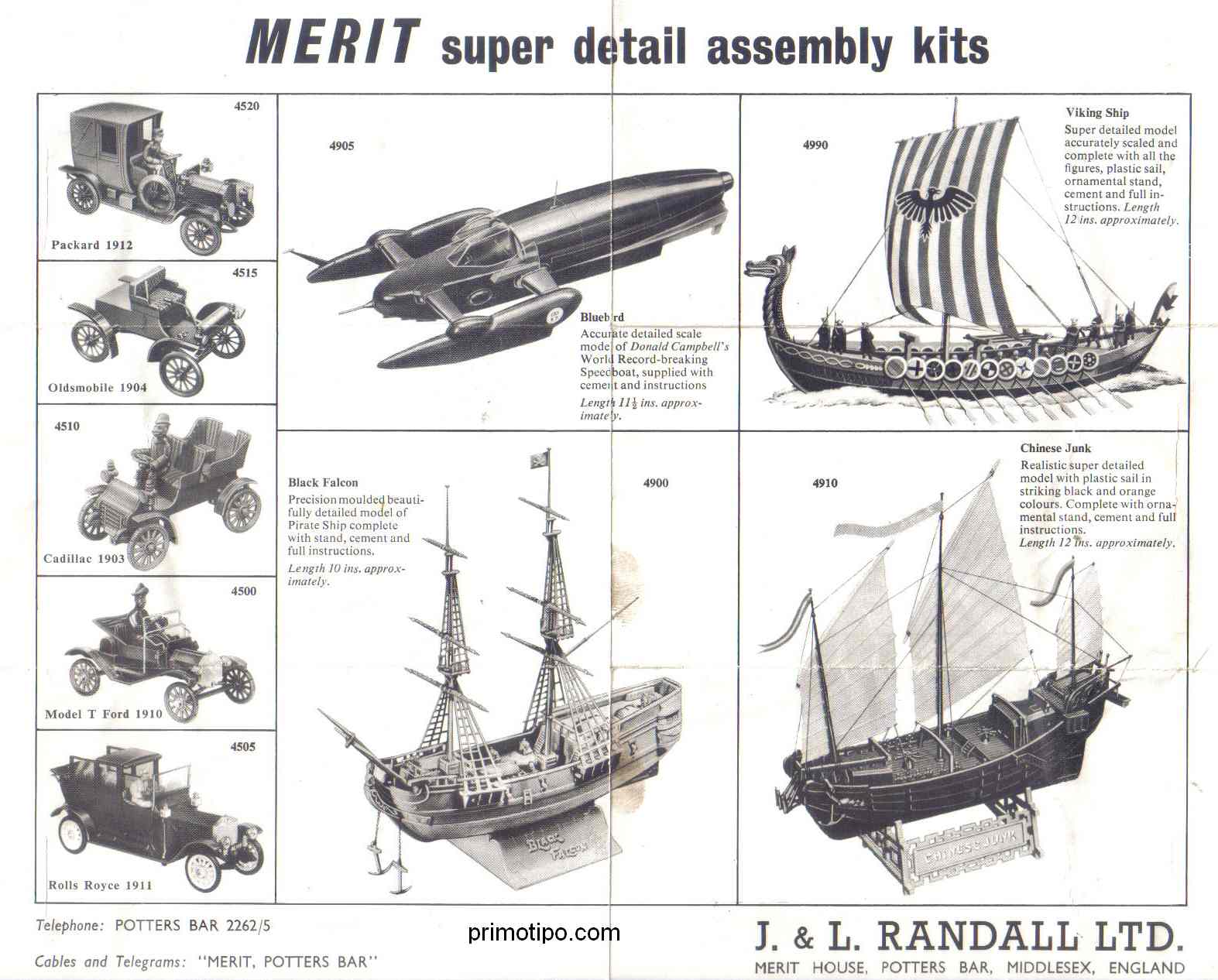 Sept 55 (MS Archive 18/4/15) “J & L Randall Ltd have introduced a Merit Outfit plastic assembly kit which makes up into a 1912- model-T Ford two-seater complete with driver. Their address is Potters Bar, Middelsex.” p43
