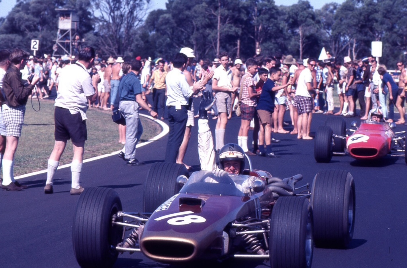 ‘Graham Hill was driving our new Brabham (BT11A Climax) at Warwick Farm in 1965.When we fuelled the car, an hour before the race, one tank was leaking through a crack in its top edge. I went into panic mode, Graham, however, asked me to go to the toilet and bring him back a bar of soap. He made this into a putty mixture and plastered it into the crack. As he explained, the leak was on the top of the tank, so after a few laps the fuel would be below the problem area. I used this fix a few times over the years. Can you imagine this sort of thing happening to an F1 Ferrari or McLaren?!