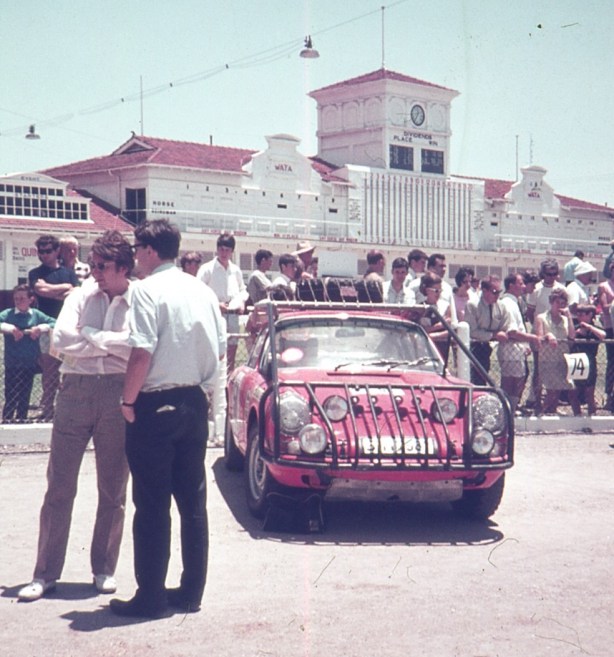 ‘The mighty Zasada/Wachowski Porsche waits to leave at Hindmarsh Station. It finished in 4th place. Its interesting ‘kangaroo catcher’ was never tested.’