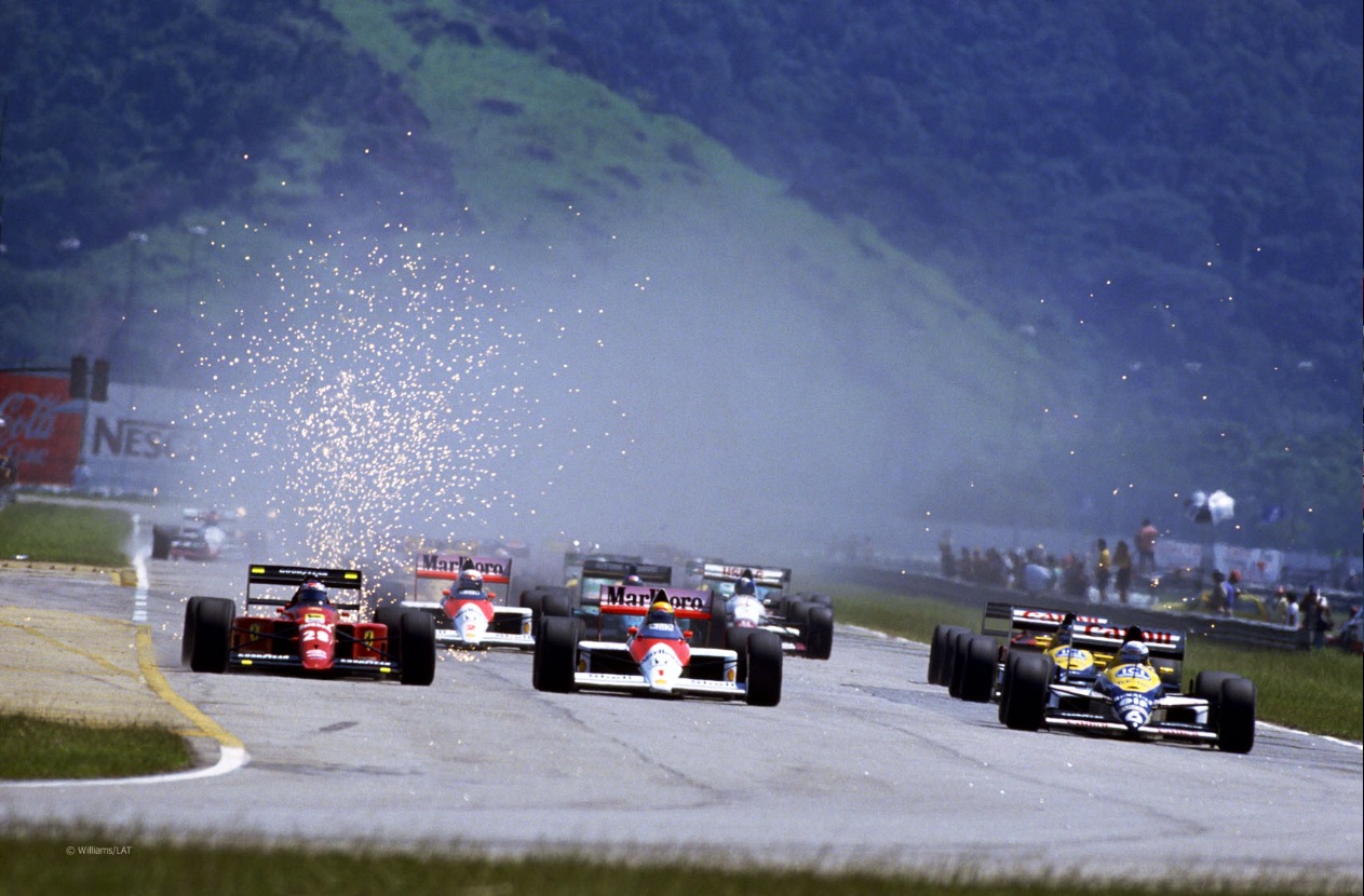Start of the 1989 Brazilian GP with L>R Berger, Prost, Senna, Patrese and Boutsen behind him…Ferrari 640, McLaren MP4/5 Honda x2 and Williams FW12C Renault x2. Winner Mansell is not to be seen, he won from Prost and Mauricio Gugelmins’ March CG891 Judd. (Unattributed)