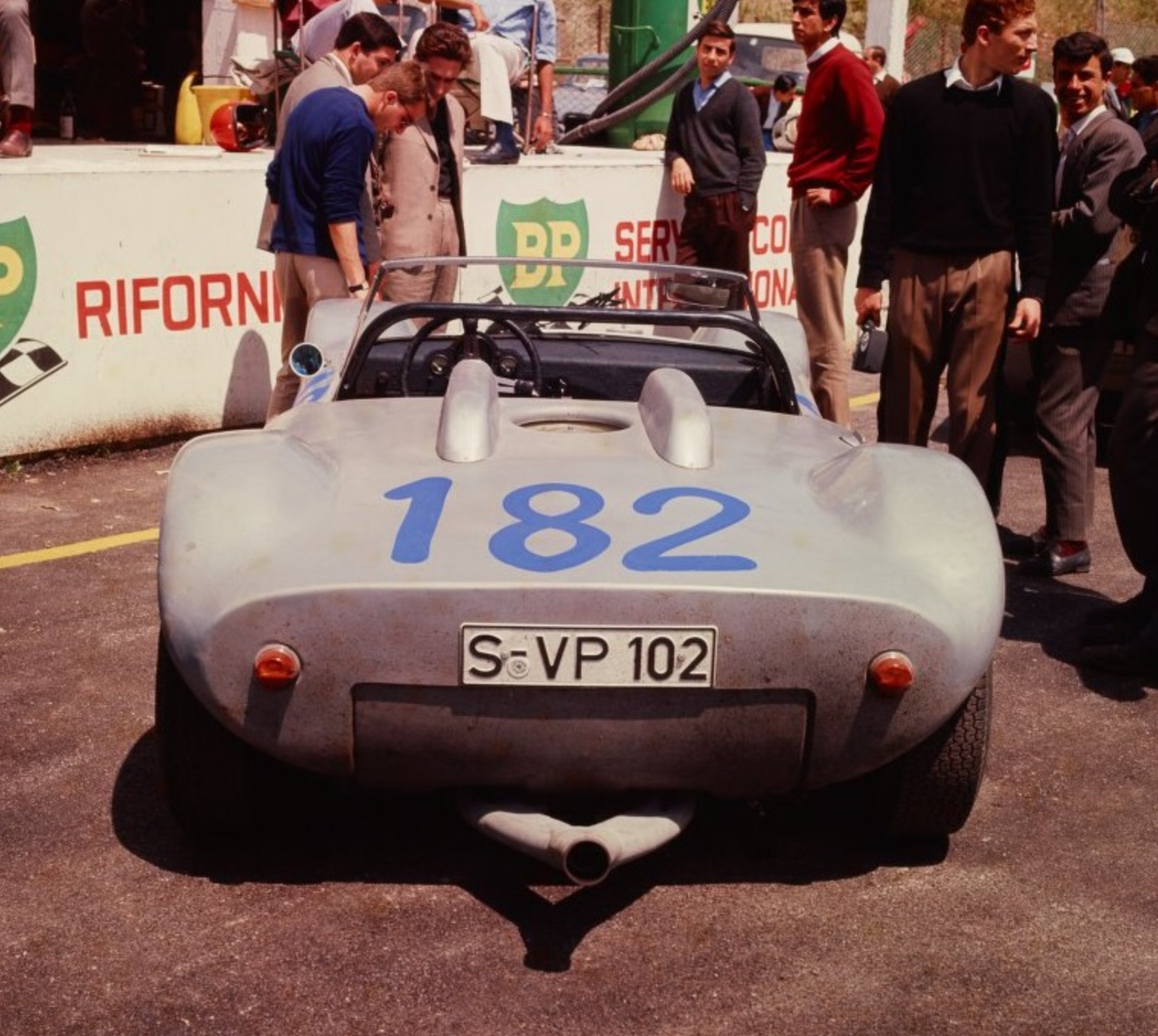 The Glass Super Squalo being pushed thru the leafy surrounds of Albert Park during the Melbourne GP/Victorian Tourist Trophy meetings in November 1958. First meeting with the cars new 2.5 litre engine. (Kevin Drage)