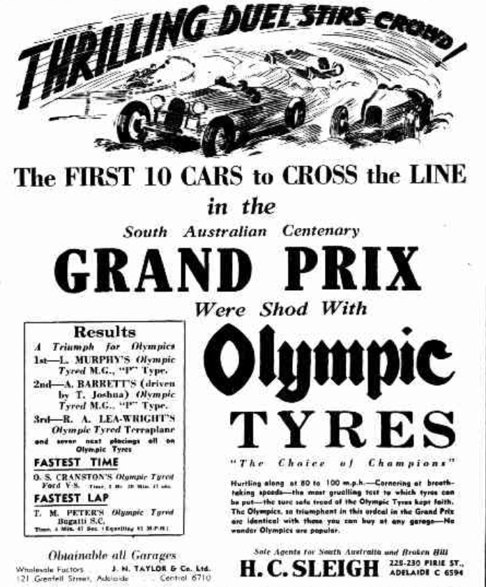 Before the biggest crowd ever seen at an Australian road race, the South Australian centenary Grand Prix and sidecar tourist trophy races on the Port Elliot-Victor Harbor racing circuit filled the quiet country air with a thunder of power. Les Murphy, winner of the ‘Victorian Centenary 300′ in 1934, the Australian Grand Prix at Cowes, (Vic) in 1935, and one of the best known motor speed men in Australia, ran away with the Grand Prix after 250 miles of supremely consistent driving, while opponents in faster cars failed when the final test of endurance was applied. He averaged 68 1/2 miles an hour to win the first prize of £200 and a £50 gold cup.