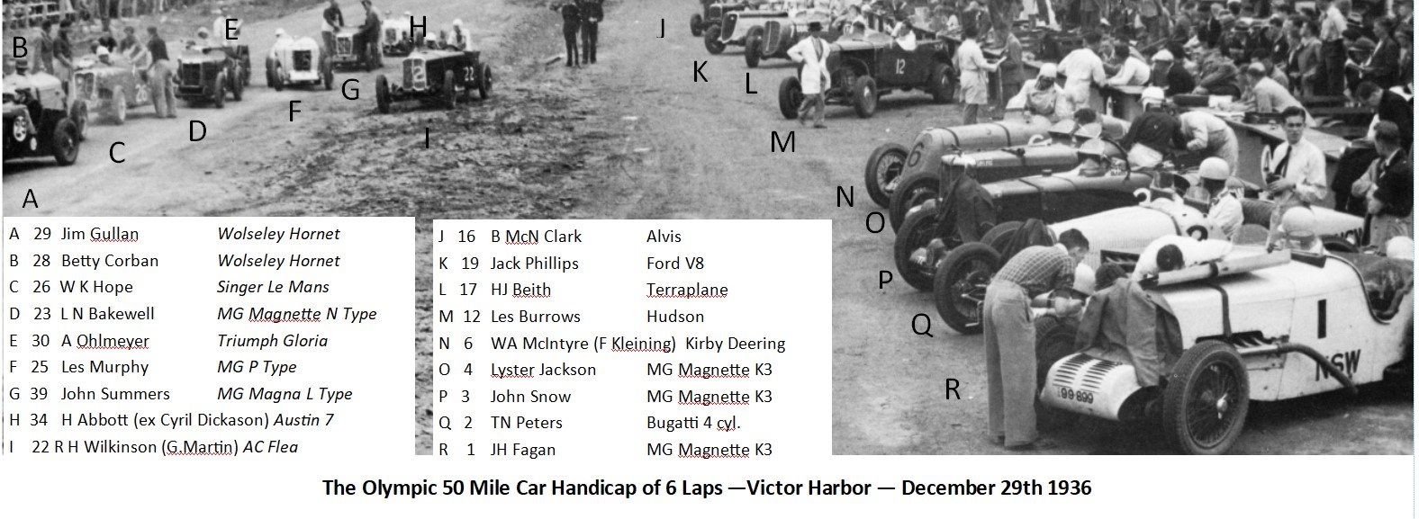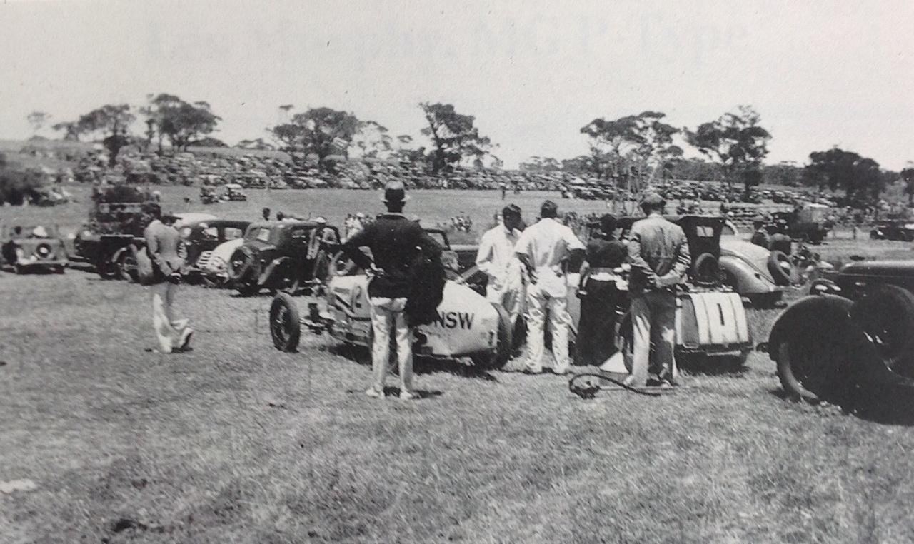 The first of the long stream of cars, charabancs, motor cycles, and bicycles which conveyed the invading army of 45,000 to 50,000 spectators to the course left Adelaide at dawn, (Victor Harbor is 85 Km from Adelaide) and long before the start of the sidecar tourist trophy, vantage points on each of the five corners of the circuit were taken up. The crowd seethed with excitement from the moment when the 12 riders in the opening race roared away in a massed start to the fall of the checkered flag until the winner of the Grand Prix flashed past the finishing line. Paling into comparative insignificance when seen against the sustained thrill of the motor event, the motor cycles prepared the onlookers for the motor racing spectacle...There were no serious accidents, but many narrow escapes in the Grand Prix kept the crowd on its toes throughout the day. At several points the efforts of police and race officials were unavailing when the spectators broke through the barriers to watch the cars flash past.’