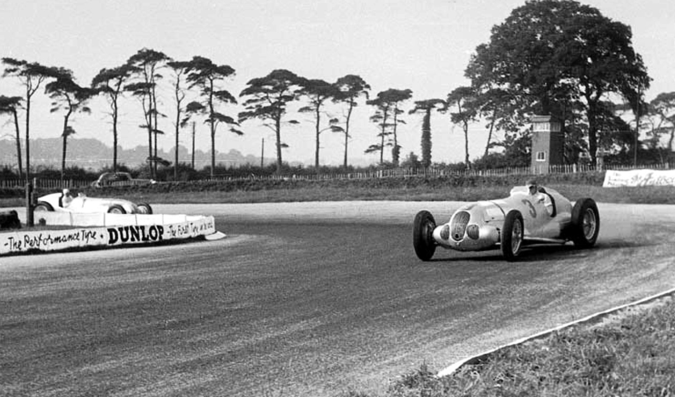 1937 Donington GP. Manfred von Brauchitsch from Rudy Caracciola, Mercedes W125. Rosemeyer won in his Auto Union from Manfred and Rudy. (unattributed)