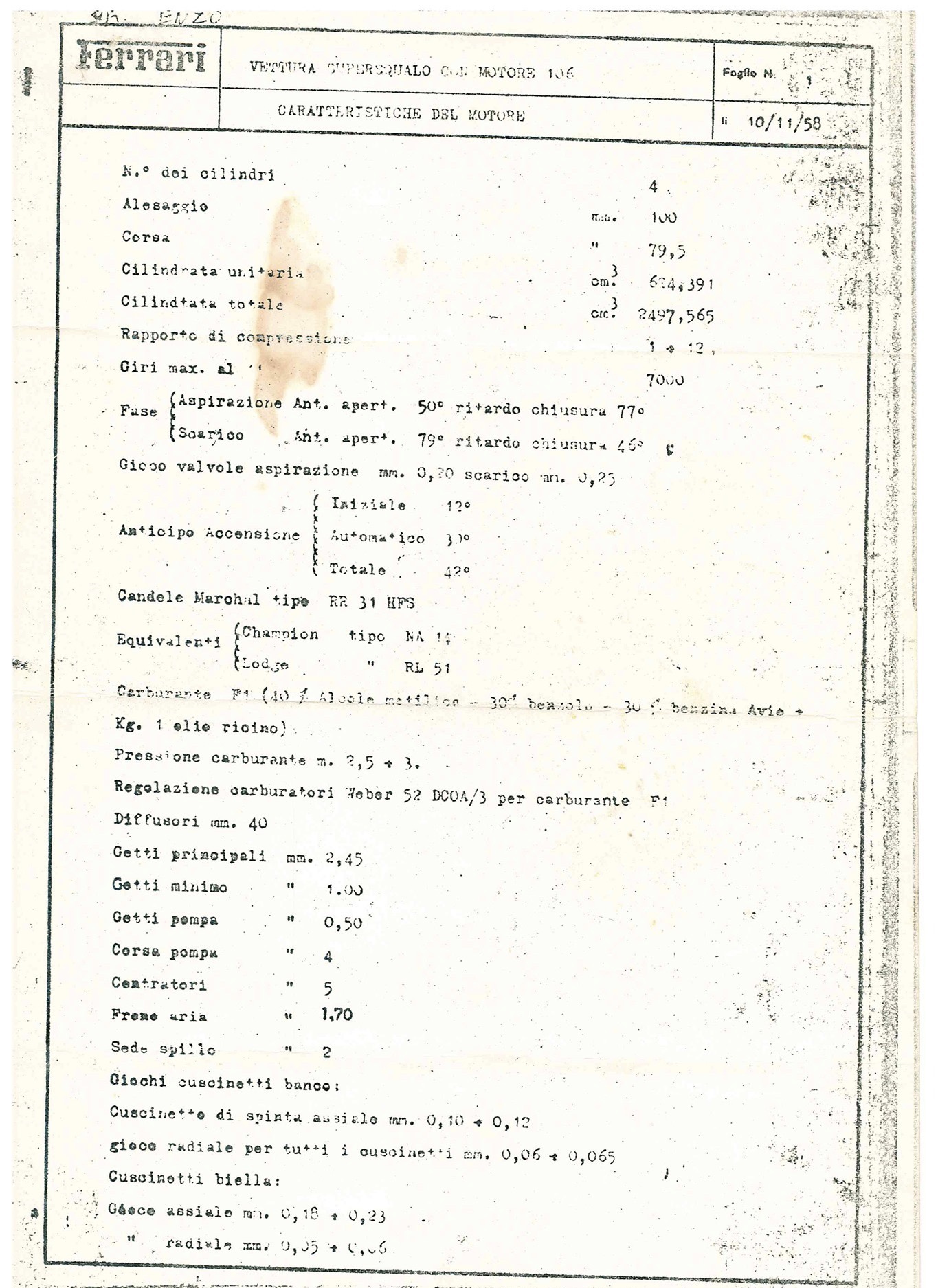 The engine was sent to Maranello for repair, but there were no 3.4 litre Monza spares available so a 2.5 litre 1956 GP engine was sent back to Sydney that November, factory information about the car and specifications of both engines are included at the end of this article.