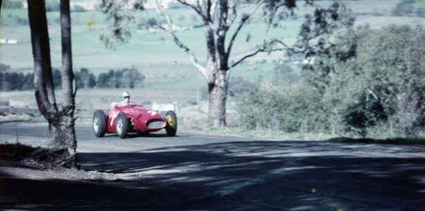 Arnold Glass eases his Ferrari 555 Super Squalo into Mount Panorama’s tricky Esses as he starts the plunge down the mountain, Easter 1958…
