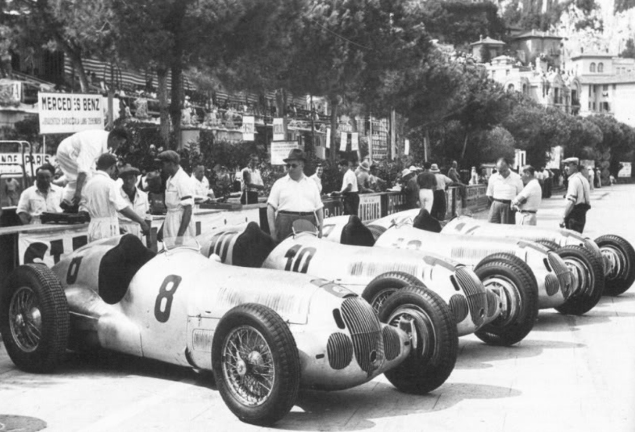 Mercedes team lineup of W125’s at Monaco 1937. #8 Caracciola 2nd, #10 Von Brauchitsch 1st, #12 Christian Kautz 3rd and #14 Goffredo Zehender 5th. Rosemeyer, the best placed Auto Union was 3 laps behind Von Brauchitsch! (unattributed)