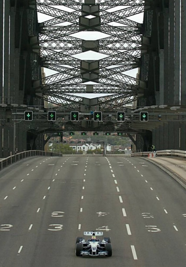 On 27 February 2005 Mark Webber did ’10 laps’ of Sydney Harbour Bridge in his Williams FW26B BMW F1 car…
