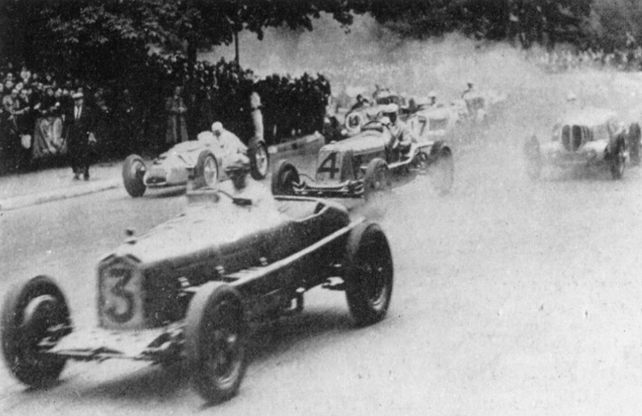 ‘Coupe des Prisoniers’ start with the #3 Philipe Etancelin Alfa Monza 8C2300, #4 Louis Gerard Maserati 8CM to the left Raymond Somners’ Talbot Lago T26 ‘Monoplace’ and #17 Roger Wormser Delahaye 135S in shot. (Unattributed)