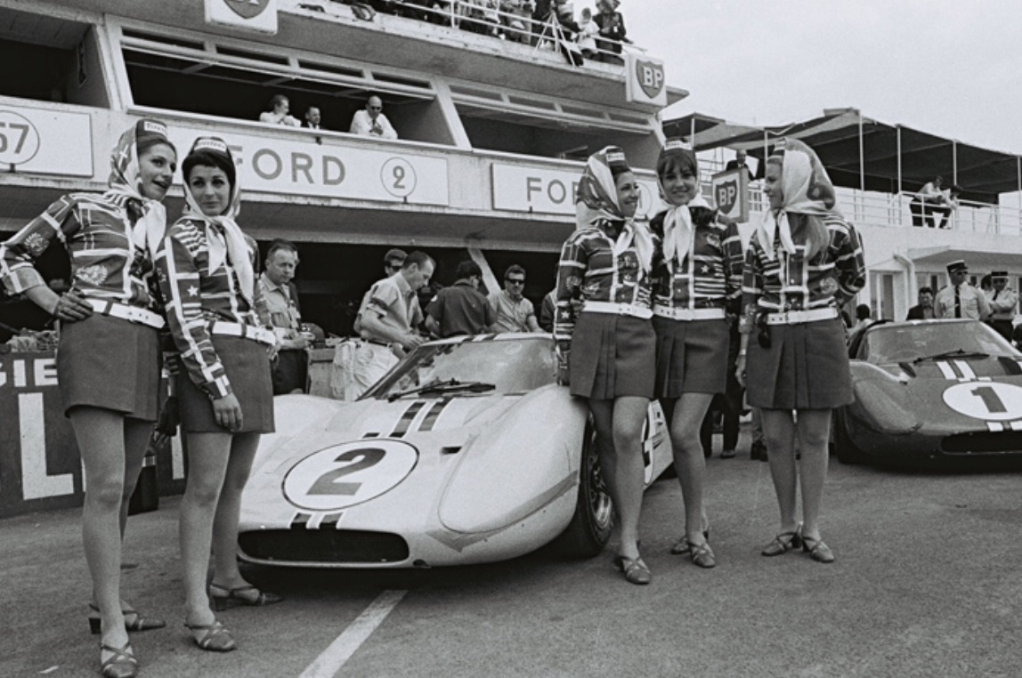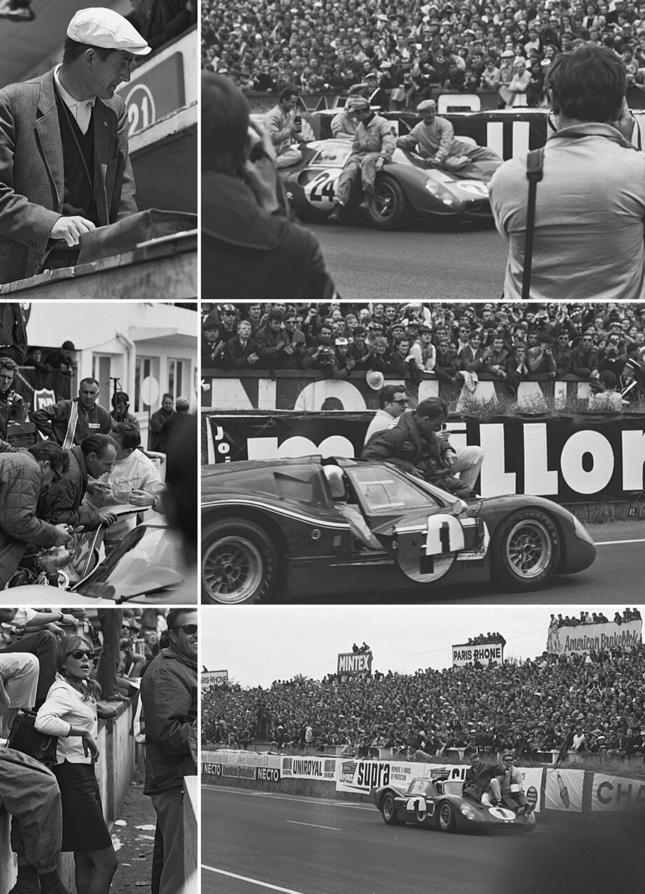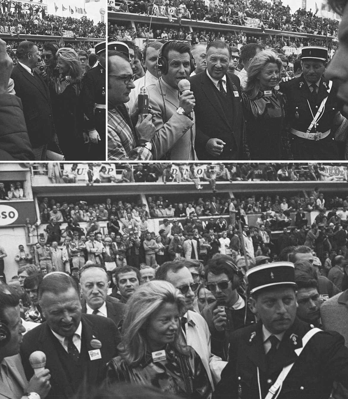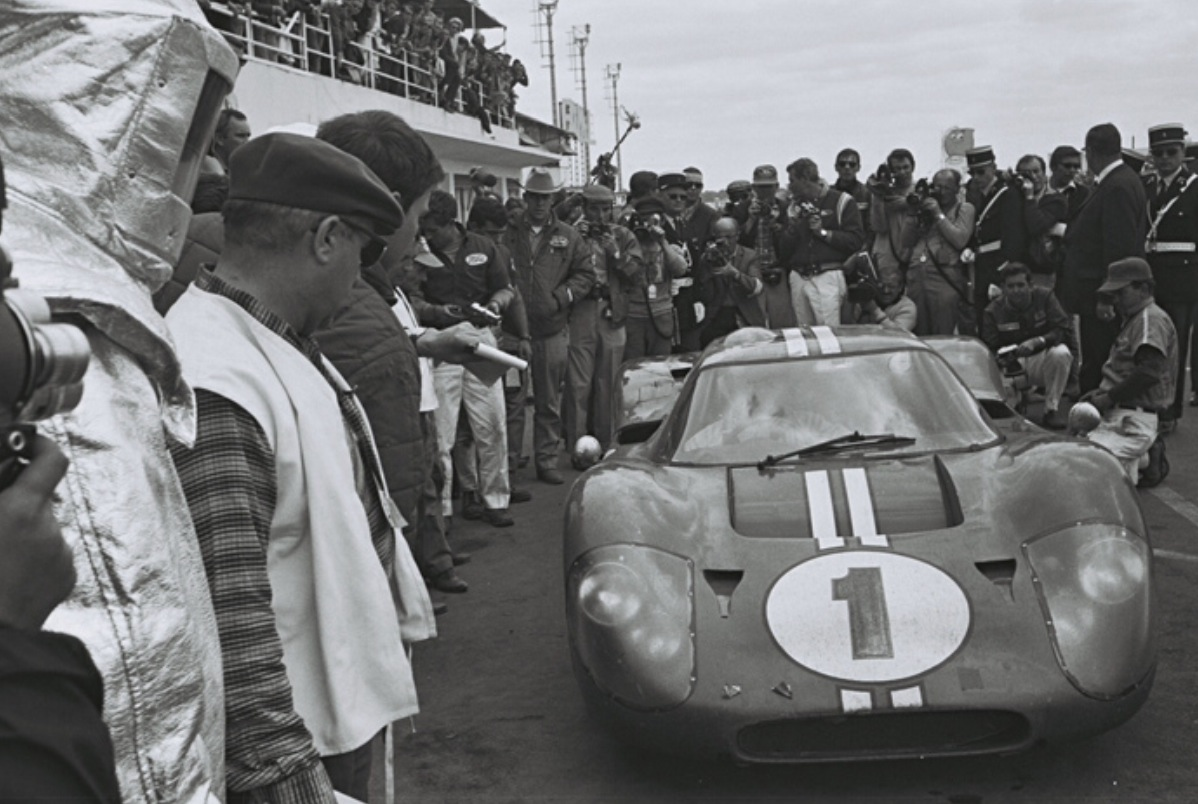 #2 McLaren/Mark Donohue 4th and #1 Gurney/Foyt 1st Ford Mk4’s with friends before the start.