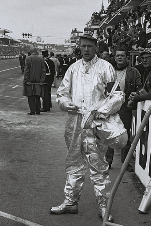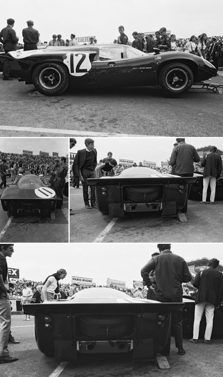 Dan Gurney is the bolter at the start in #1, #2 McLaren Mk4, #7 Chap Spence putting on his full harness, alongside him #3 Andretti and #4 Hulme both in Mk4’s doing the same.