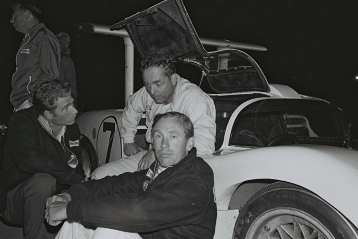 Chaparral council of war in the middle of the night. Jim Hall , Phil Hill and Mike Spence curse the cars auto gearbox, its weakness that year. The one bright spot for the fastest, most innovative and stunning sports/prototype of 1967 was its season ending Brands Hatch 6 Hour victory in July.