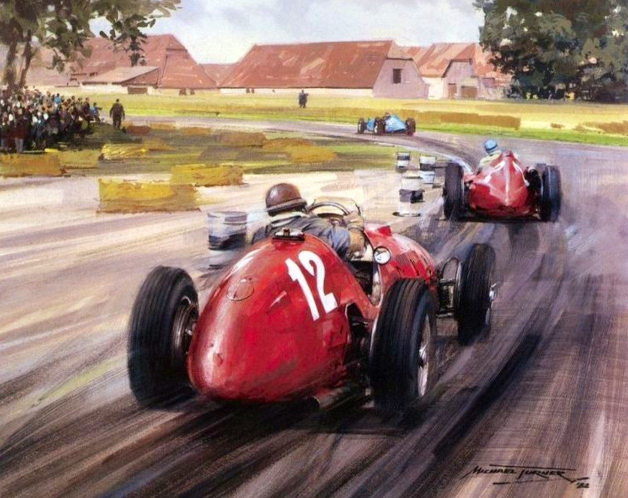 Painting depicts Gonzalez’ pursuit of Fangio with a blue Talbot-Lago T26 ahead (Michael Turner)