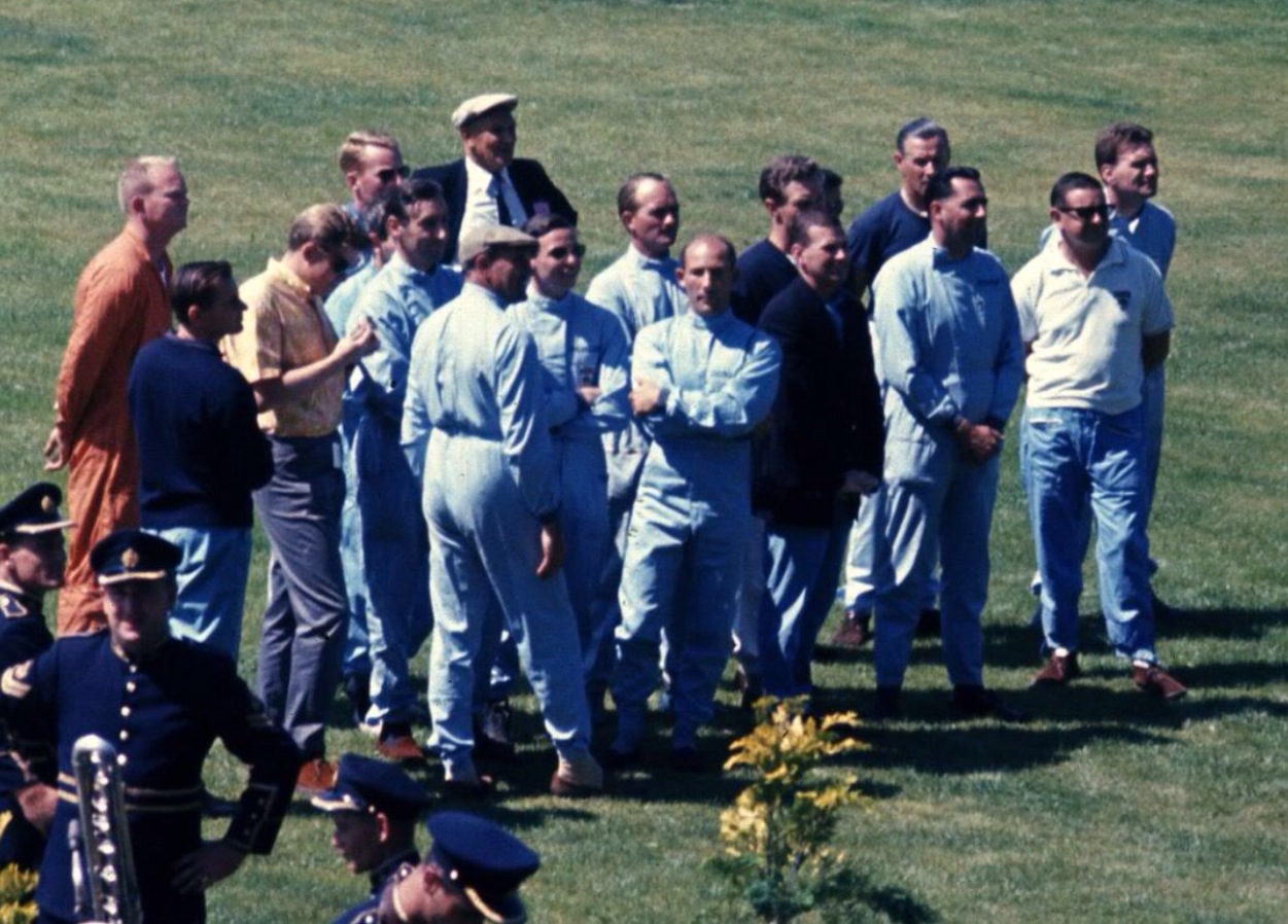 Drivers gather before the start of the 1962 ‘Sandown International’, the dudes in uniforms are members of the band. L>R; orange clad Daigh, dark blue jumpered McLaren, nattily dressed Reventlow, light haired John Youl at rear, with a flat-cap official type chap. Roy Salvadori in front of Youl, Lex Davison in the light colored flat-cap. To his right Jim Clark, a balding Angus Hyslop beside and behind Jimmy, the similarly hirsute Stirling Moss in front of Hyslop, obscured Ron Flockhart, (shortly thereafter in April to die 25Km away in the Dandenong Ranges when his Mustang P51 ex-fighter crashed shortly after take off on a record breaking attempt to Europe) sports-blazered Bib Stillwell, then Doug Whiteford behind Jack Brabham, Bill Patterson and far right Austin Miller (John Ellacott)