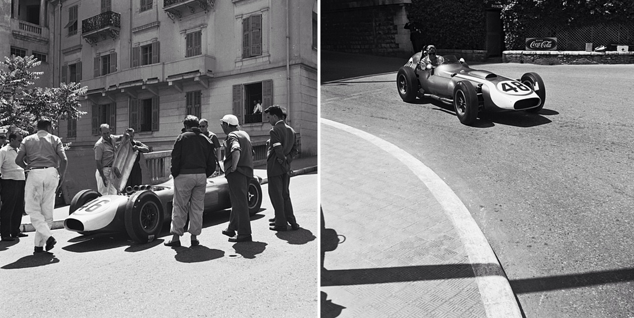 Daigh Monaco 1960. Both cars DNQ, Stirling Moss also did some laps of the Scarab in practice to give his opinions of the car. The difference between his light, nimble mid-engined Lotus 18 Climax and heavy front engined Scarab complete… (Dave Friedman)
