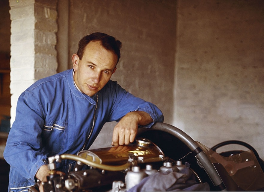 Historically significant photo; Jack Brabham is taking a close look at the Scarab RE’s 3.9 litre aluminium Buick V8, the first time he had seen one. The sister engine to this, the ‘Oldsmobile F85’ was the basis of Brabham’s Repco Brabham ‘RB620’ 1966 World Championship winning 3 Litre GP engine (Jack Brabham by Doug Nye)