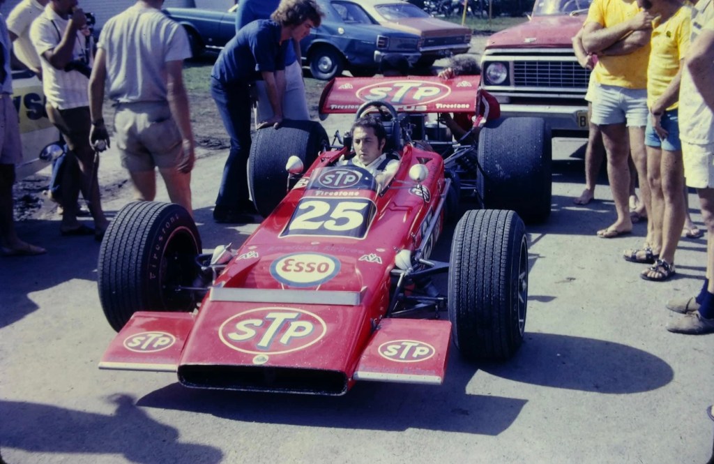 Cannon crashed his McLaren M10B at Sandown in the second last 1971 Tasman round. He did a deal to run the STP owned Lotus 70 Ford raced by David Oxton and Chris Amon throughout that series at Surfers Paradise, the final race, finishing a distant seventh in the unloved car (#70-02). Here he is getting the cockpit comfy during practice.