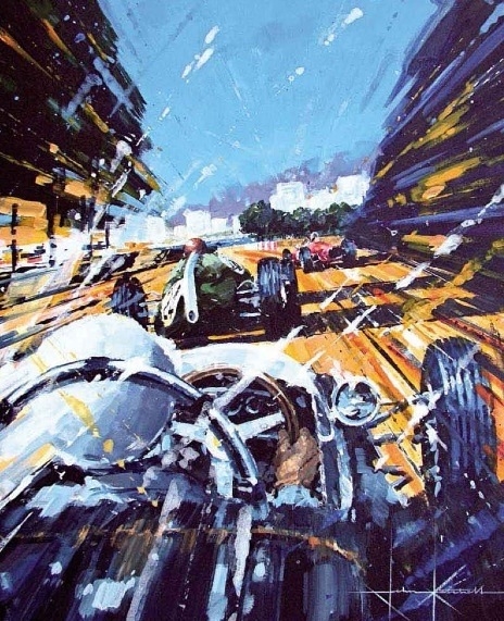 However, the mastery of Moss prevailed several times during 1961. The first of these performances in his lithe, nimble 1.5 Coventry Climax Mk2 engined Lotus 18 is portrayed in the season opening event by John Ketchell’s art.