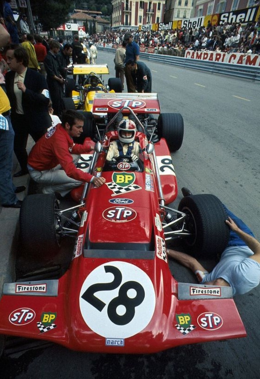 Amons March 701 being tended by the cars designer Robin Herd at Monaco 1970, Q2, DNF suspension failure,Ronnie Peterson’s customer, Colin Crabbe owned yellow March 701 behind. Rindt won in a Lotus 49C Ford (unattributed)