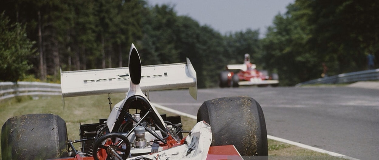 Ian Ashley’s Williams FW03 Ford sits forlornly beside the Pflanzgarten Armco while Niki Lauda turns in, Ferrari 312T, Nurburgring, German GP practice 1 August 1975…