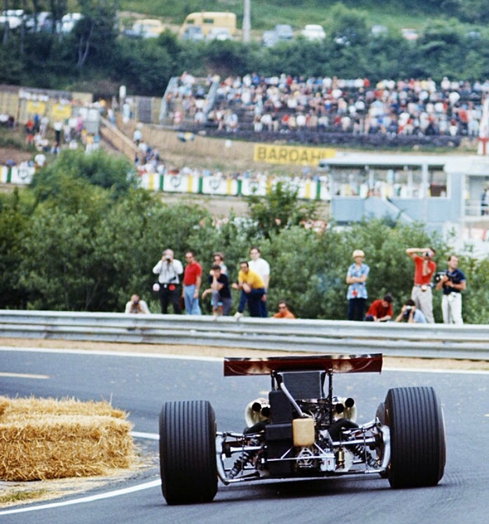 French GP, Rouen 1968. Q5 and 10th in the race won by teammate Ickx, the ‘rainmaster’ who started the damp race on full wets and drove away in the early laps when, again, a driver, Jo Schlesser, died in another fiery accident in the Honda RA302. These accidents accelerated changes to circuit and car safety, not that they were the last horrible fiery deaths in the period. Amazing Rainer Schlegelmilch shot of Rouen and the butt of Amons 312; look at the hay bales, tyre distortion and the presence of wings which grew thru ’68 (Schlegelmilch)