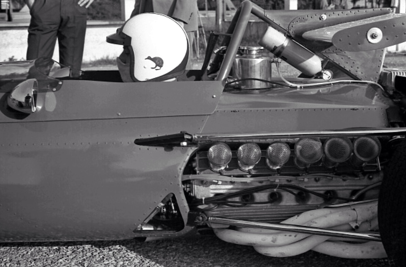 He beat the factory Lotus 49s of Hill and new-signing and probable ‘fastest guy on the planet’ Jochen Rindt taking four wins including the NZ GP at Pukekohe and AGP at Lakeside. The series of depth also included Derek Bell (in the other Dino), Frank Gardner (Mildren Alfa T33 V8) and Piers Courage (Brabham BT24 Ford DFW).