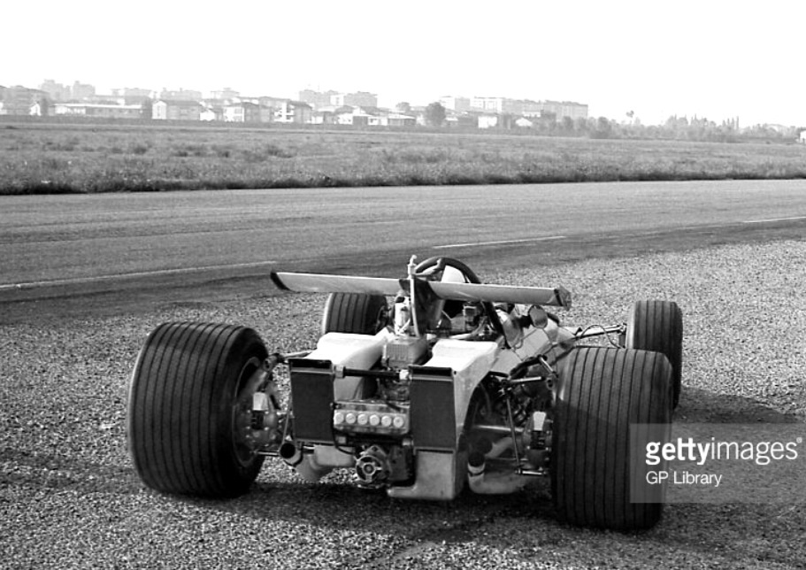 Amon putting the movable wing to good effect at Monza in 1968. Q3 and DNF after an accident, Hulme won in a McLaren M7A Ford (unattributed)