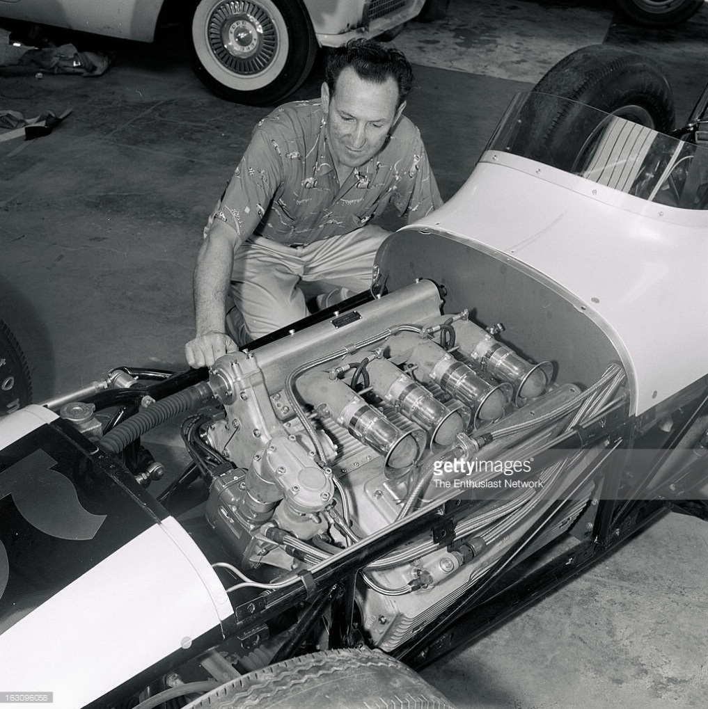 Matich leaniang against the back of the car, Australian TT, Longford Tasman meeting March 1960. #32 John Ampt, Decca and Derek Jolly’s Lotus 15 Cliimax to his left and back. (Kevin Drage)