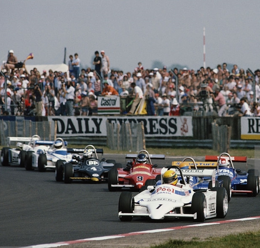 Ayrton Senna has Martin Brundle right ‘up his clacker’ during the 1983 British GP F3 support race at Silverstone, Ralt RT3 Toyota’s both. Senna prevailed by a second over 20 laps, 16 July 1983…