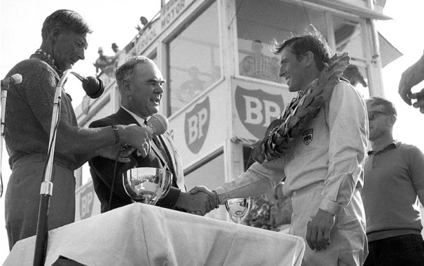 ‘So for Anthony Davison, the family representative that day, a young man, (17) after running across to the crash site and learning of Rocky’s death, he had that to deal with before, an hour or so later, having to present the new trophy named in his fathers honour to Bruce McLaren’ the race winner in his Cooper T79. Jack was next, 3 seconds behind in his BT11A and Phil Hill a further second back in Bruce’ Cooper T70.